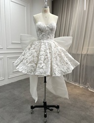 Ivory Strapless Mini Wedding Dress with 3D Floral Lace and Back Detachable Bow for Bridal Party Engagement Events